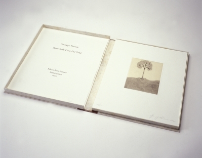 Giuseppe Penone not only created the illustrations for this outstanding artists’s book, but also wrote the poems. For the prints he used a variety of etching techniques, including dry needle and aquatint. There are even some pictures in which he used his saliva to restrict the flow of the acid on the plate. Some of the poems are about the breathing process of humans and natural organisms. Others describe the tree as the eye of the world or deal with the symbolism of a fingerprint. The pictures reveal the same intense relationship with nature: a backbone is depicted as a bird’s feather and a pile of trees is cut into beams that do not have the usual square shape, but retain the natural form of trunk and branches.