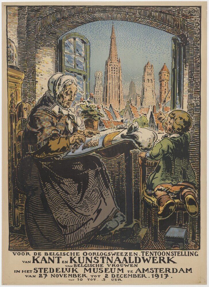 Voor de Belgische oorlogswezen. Tentoonstelling van kant en kunstnaaldwerk van Belgische Vrouwen in het Stedelijk Museum te Amsterdam