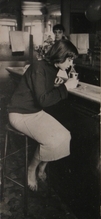 Michèle Bernstein aan de bar in Chez Moineau