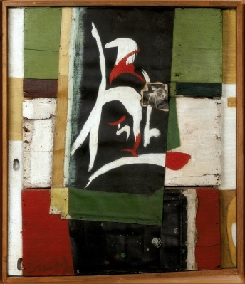 Eugène Brands made his first surrealist assemblages during the Second World War. ‘The Constellation of Orion’ comprises a number of painted cupboard shelves onto which the artist glued canvas and a magazine photo of the star constellation Orion. A black star-studded sky is painted on a section of canvas on the bottom shelf. A ‘sign’ resembling a Japanese character has been painted on the canvas placed across the shelves. The power of the work is enhanced by the use of a restricted palette mainly consisting of the colors black, white, green and red. From an early age, Brands was fascinated by magical elements such as the infinity of the cosmos and perpetual movement. These themes feature prominently in his work. ‘The Constellation of Orion’ was first displayed in the legendary CoBrA exhibition ‘Exposition Internationale d’Art Experimental’ staged in 1949 at the Stedelijk Museum. Brands was briefly affiliated with the CoBrA movement.