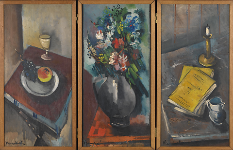 Triptyque: Nature morte au verre / Fleurs / Nature morte au chandelier