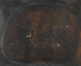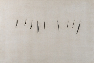 Lucio Fontana’s Concetto spaziale is a canvas that is punctured as well as adorned with smashed up fragments of red Murano glass. This object in particular directly references Italy and the Italian fondness of ornament. The glass fragments and the holes function similarly by directing attention to the materiality of the canvas and the immediate space that surrounds it. These two elements act against each other in that one is an attack on the surface while the other venerates the surface with transparent embellishment and added texture. In Fontana’s work the association with the artist’s gesture is repressed and instead the holes conjure a mechanical impulse in their regularity. The title of the work is generic and Fontana used it for many of his artworks. The common thread in all the Concetto spaziale works is the desire to incorporate physical space into the composition itself.