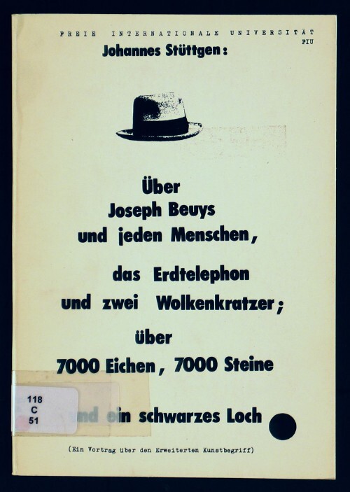 Über Joseph Beuys und jeden Menschen, das Erdtelephon und zwei Wolkenkratzer; über 7000 Eichen, 7000 Steine und ein schwarzes Loch : ein Vortrag, Hamburg 5. Juni 1982