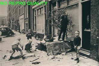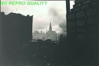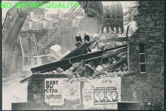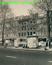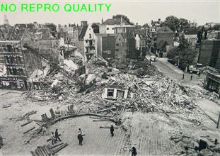 Doorkijk naar Nieuwmarkt met gesloopte huizen en Zuiderkerk.