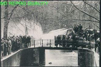 Brug met rechts politieblokkade en links een menigte mensen