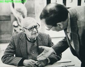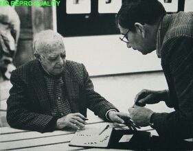 Eva Besnyö met Jan Bons aan het werk bij de Nederlandse Kunststichting