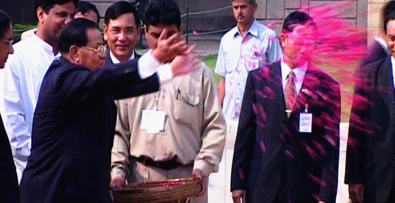 The videos from part one of The Torn First Pagesare: The Face, Thet Win Aung (a&b), Ma Win Maw Oo, The Bodhi Tree and Somewhere in May. The various parts are based to some extent on film and video material shot clandestinely in Burma. Kanwar is in contact with the Burmese resistance movement and trains ‘amateurs’ to shoot footage surreptitiously for inclusion in his work. Some of the material, however, was shot outside Burma in India, Europe, the US and Thailand. In The Face we see footage of general Than Swe, head of the Burmese junta who, in 2004, visited Rajghat, the site of Gandhi’s cremation. Swe’s visit was extremely controversial. The general is known for being very particular about his media representation but Kanwar managed to video Swe as he scattered rose petals at the hallowed place.