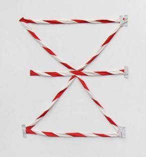 Materials: Hand-woven textile (light grey eucalyptus yarn, red organic cottolin, silver metal yarn, and white organic cottolin)