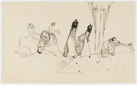 Schets voor illustratie van groep figuren in interieur