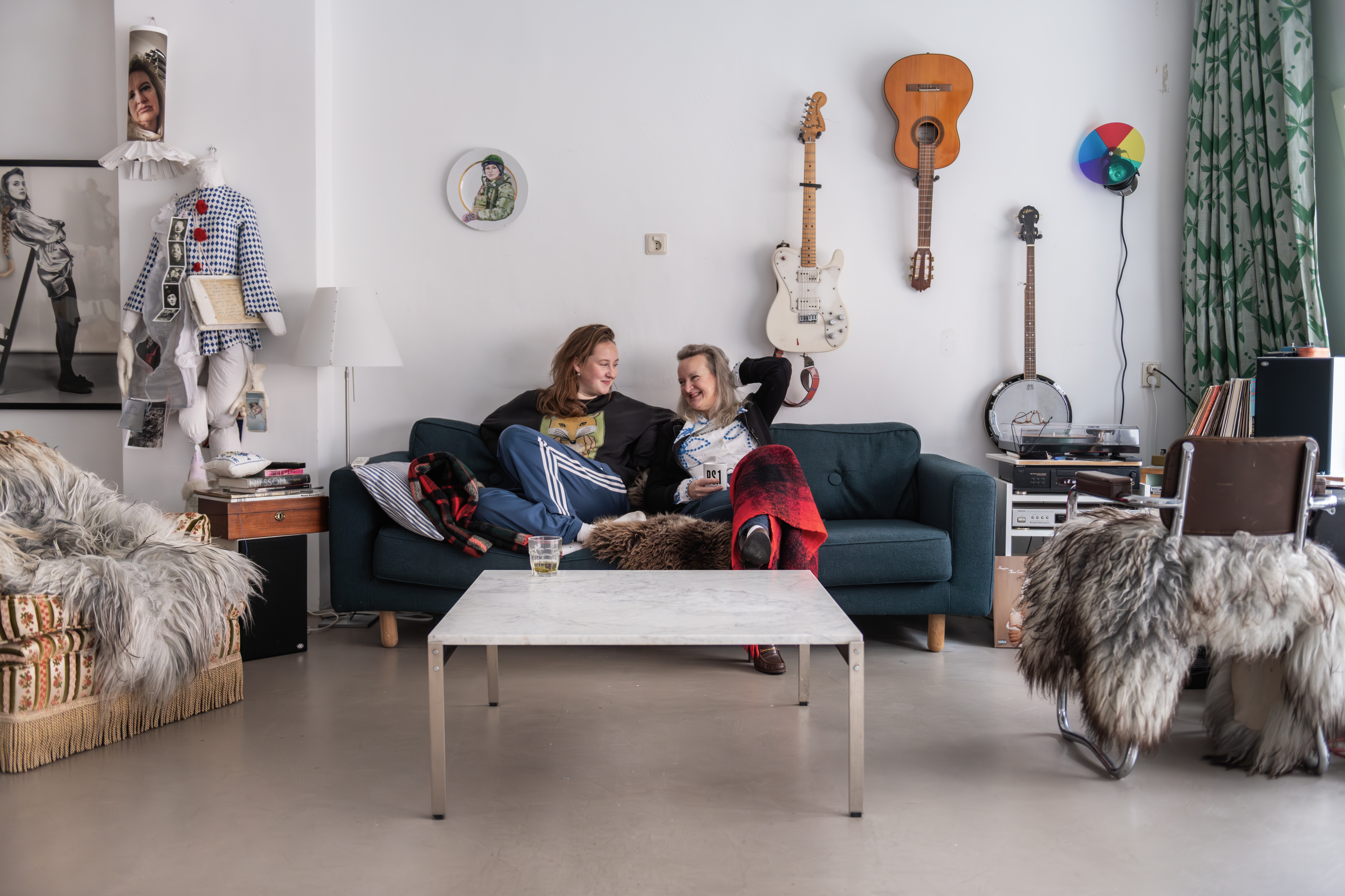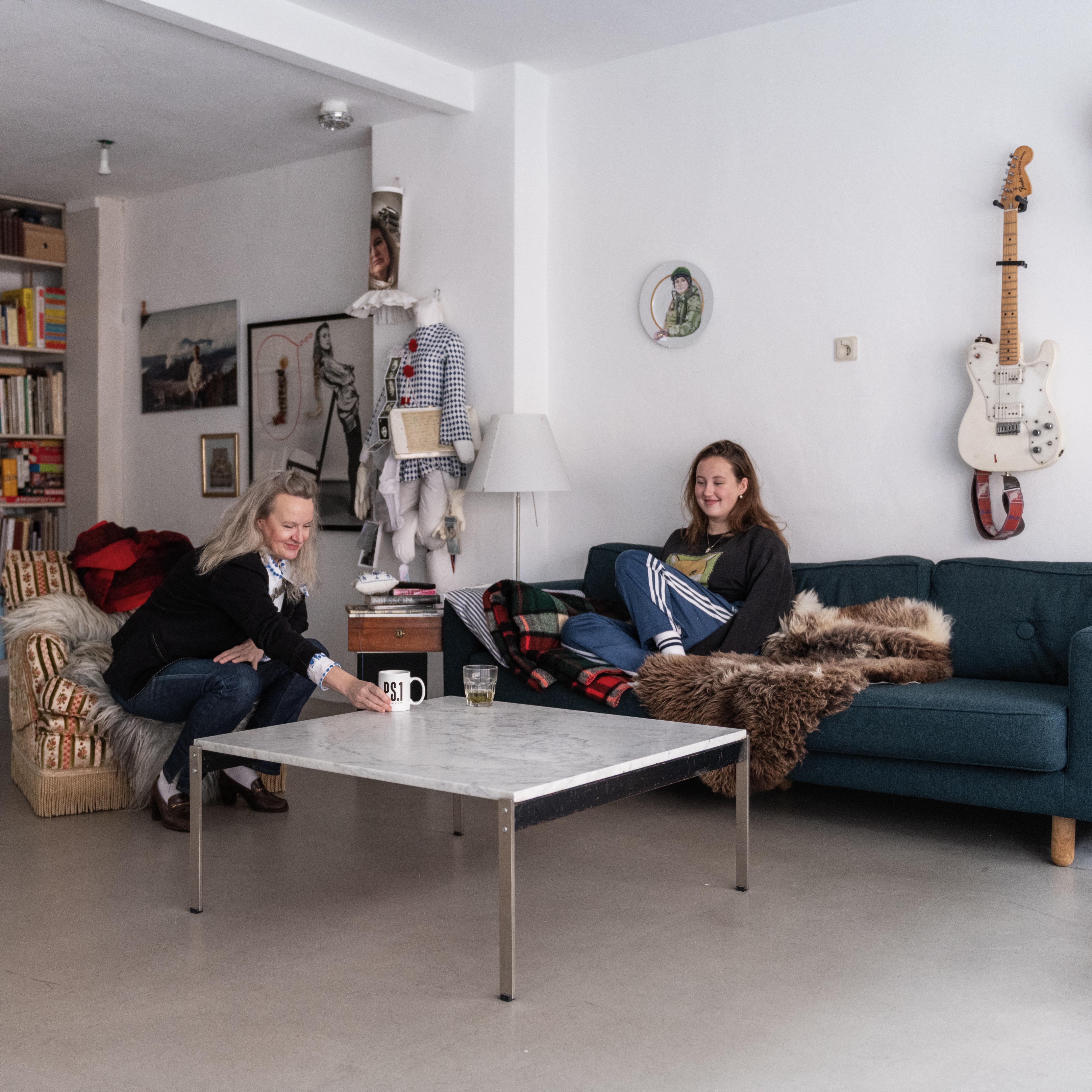 Liza May Post en dochter Josephine Duijvelshoff met tafel 849, in 1958 ontworpen door Kho Liang Ie voor Artifort. Foto: LNDW Studio