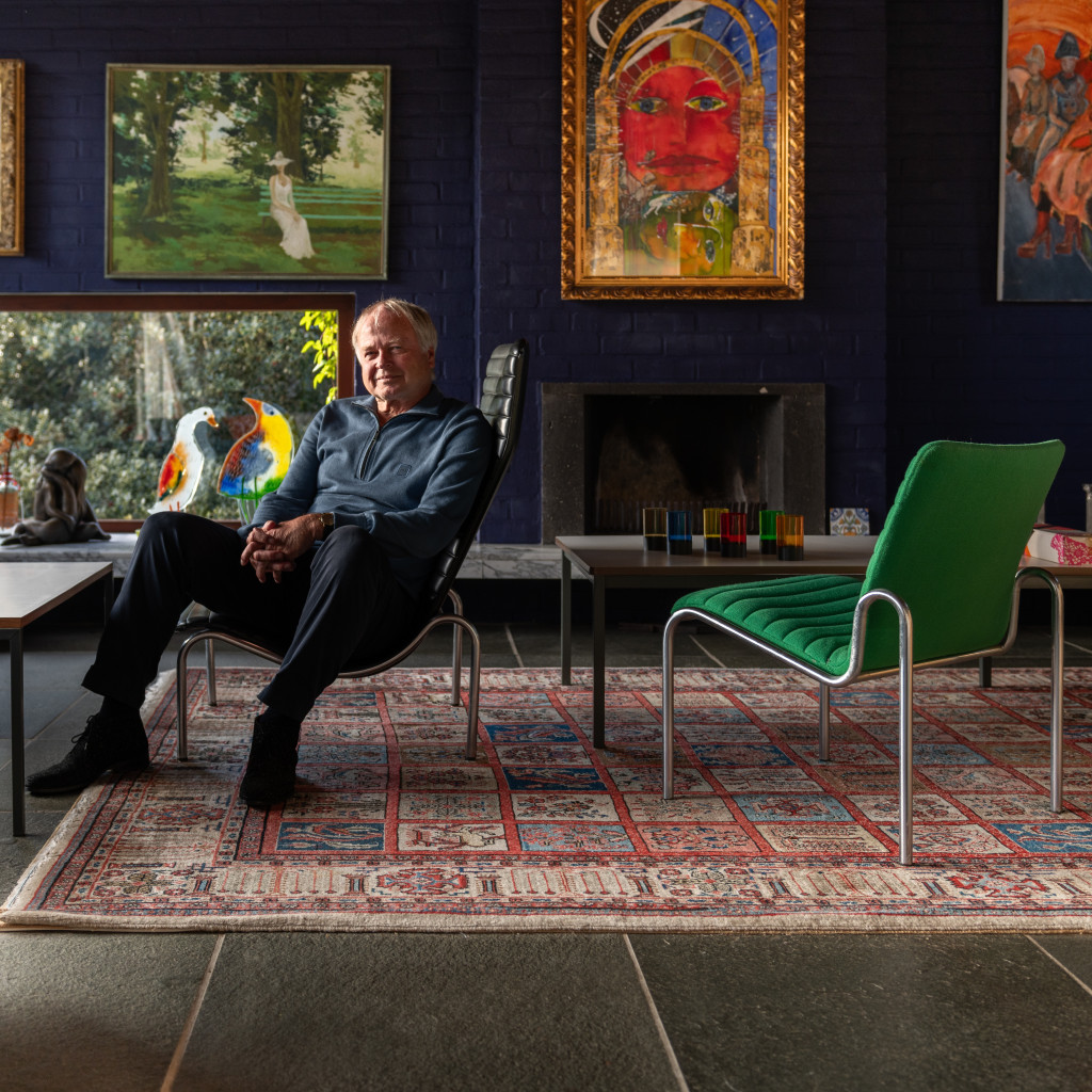 Kees Ruigrok (zoon van Jan Ruigrok, bedrijfsleider en mede-eigenaar van CAR en Stabin), met fauteuil 701 en stoel 703 van Kho Liang Ie, prod. Stabin, Woerden. Collectie Kees Ruigrok. Foto: LNDW Studio